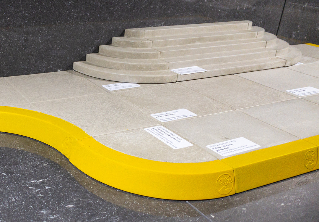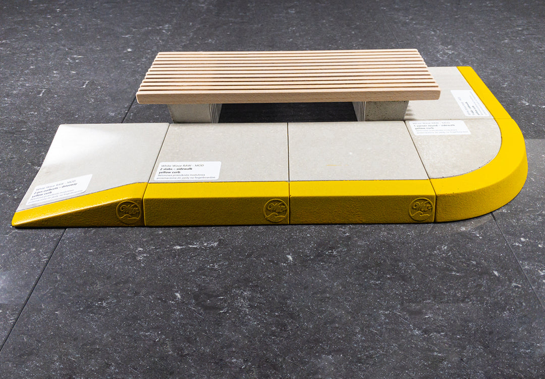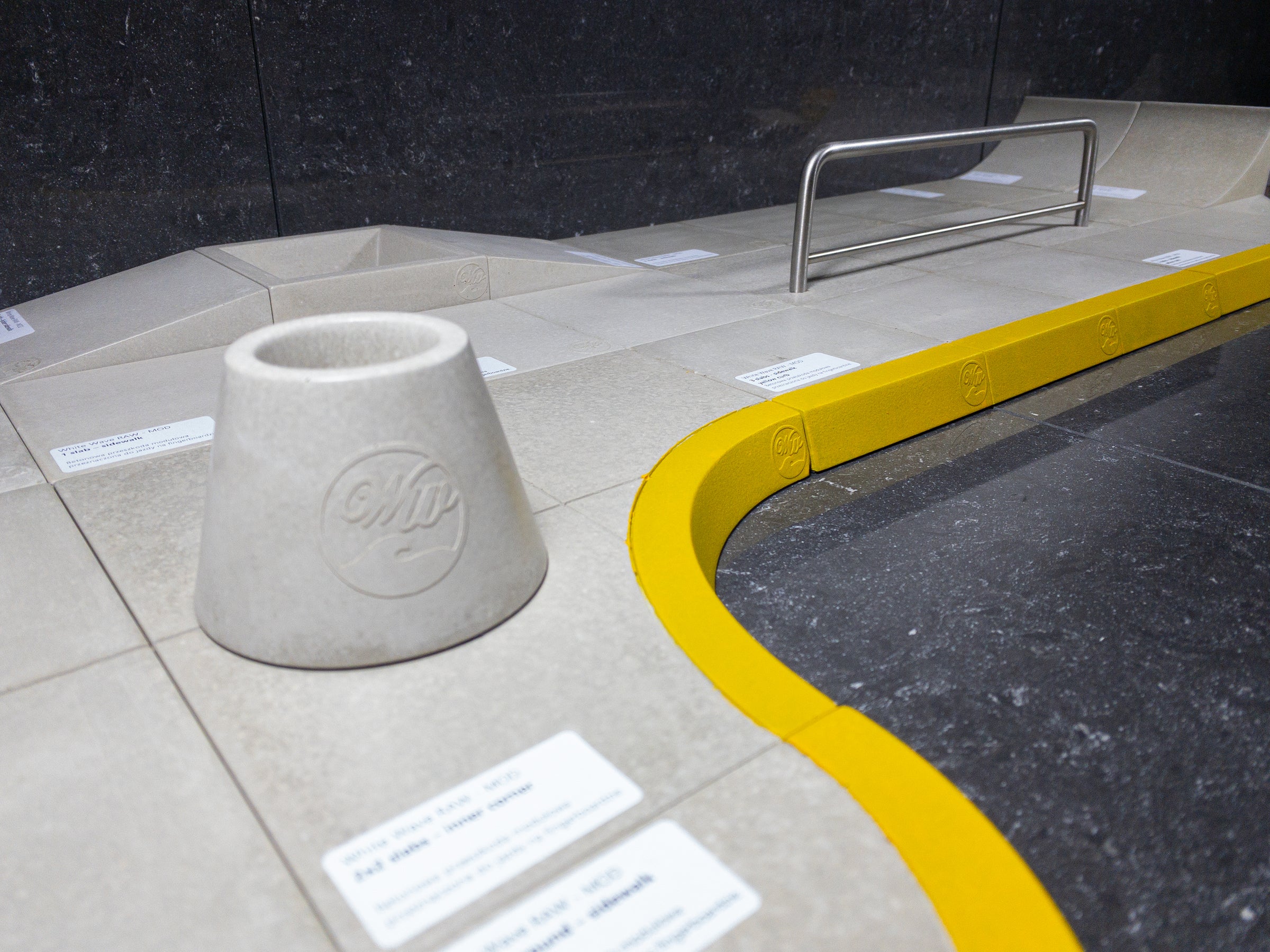 Die White Wave Raw Rampen sind aus einem stabilen, super glatten Betongemisch gegossen. Das Besondere bei dieser Mischung ist der realistische Street-Look, der durch leichte Farbunterschiede im grauen Beton und der gelben Farbe der Bordsteinkante entsteht. Es sind die kleinen Details, die einen Spot realistisch aussehen lassen.